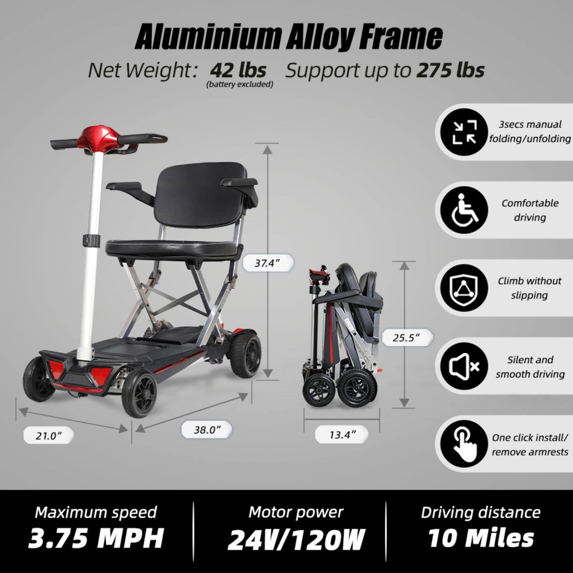 - Built with a robust aluminum frame, it weighs only 42 lbs. but supports up to 275 lbs., offering a perfect balance of portability and strength.