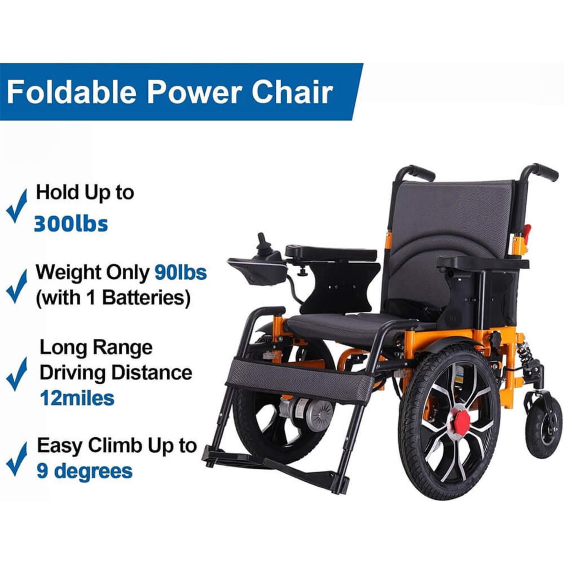 - Weighing just 38lbs without battery, this wheelchair supports up to 300lbs and folds in 3 seconds. Perfect for travel and fits easily in car trunks.