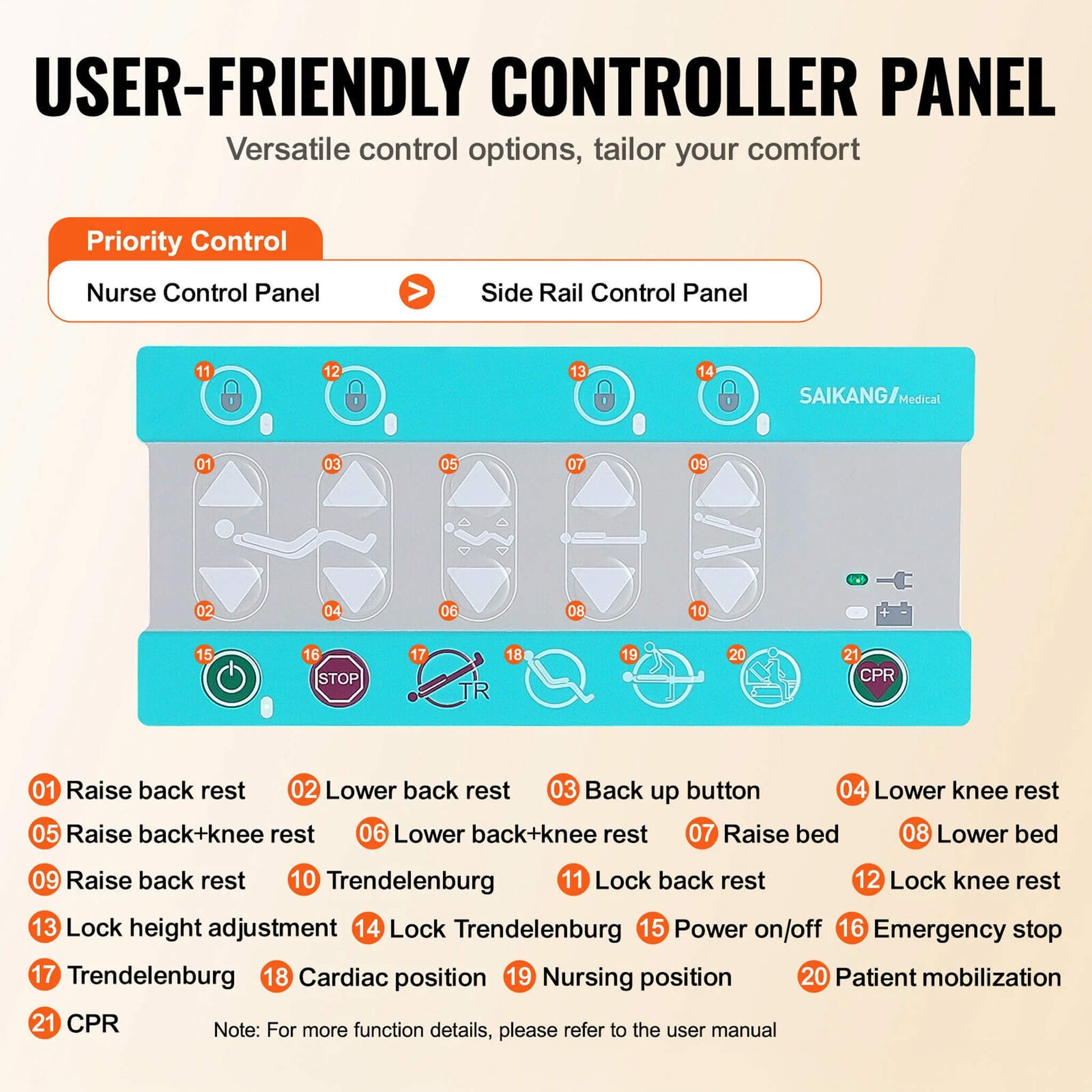 - Features two easy control options: a nurse control panel and a side rail control panel. Both allow simple, intuitive adjustments of all bed functions, powered by a reliable electric motor for smooth operation and enhanced convenience.