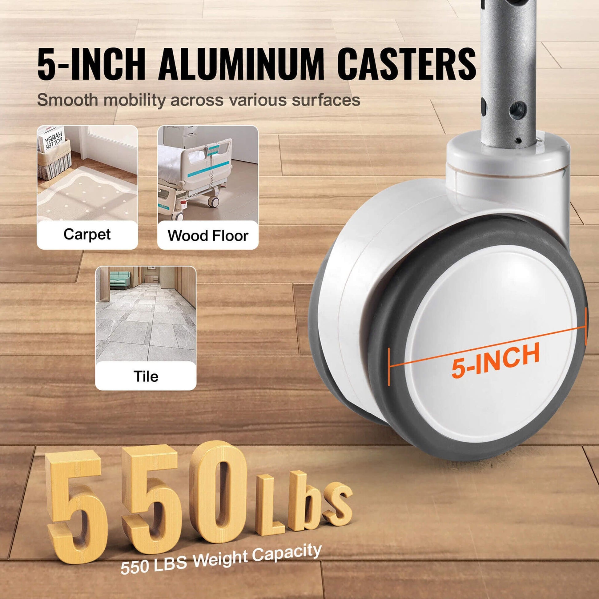 - Is equipped with 5-inch lockable aluminum casters that allow smooth and effortless mobility on carpet, wood, and tile surfaces. With a weight capacity of 550 lbs, it ensures reliable stability and safety for patients and caregivers alike.